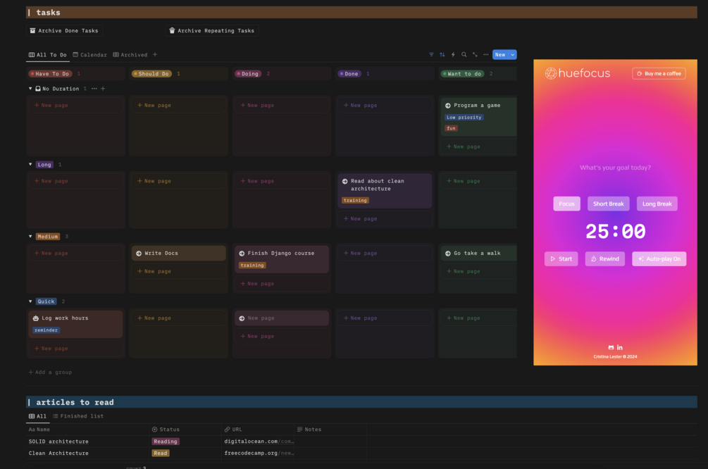 You'll get a wonderful lofi Dev Dashboard where you can stay organized at work and in your personal journey through productivity and professional development